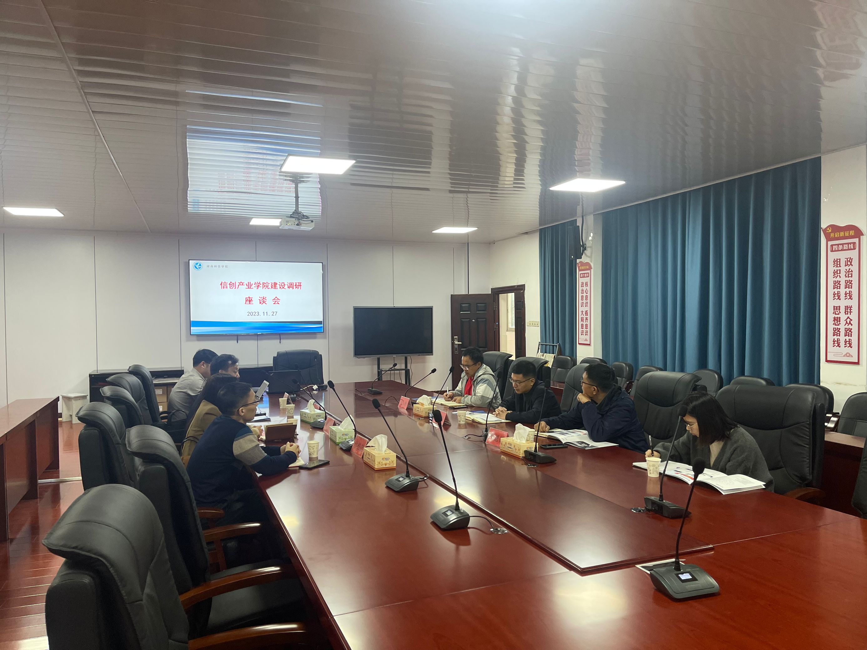本网讯(通讯员 李双 刘兵兵)11月27日,我院在知行楼106召开信创产业学院建设调研座谈会,院长尹向东,副院长罗恩韬、张彬,企业代表长沙领路信创科技有限公司董事长刘耿等参加,会议由尹向东主持。
